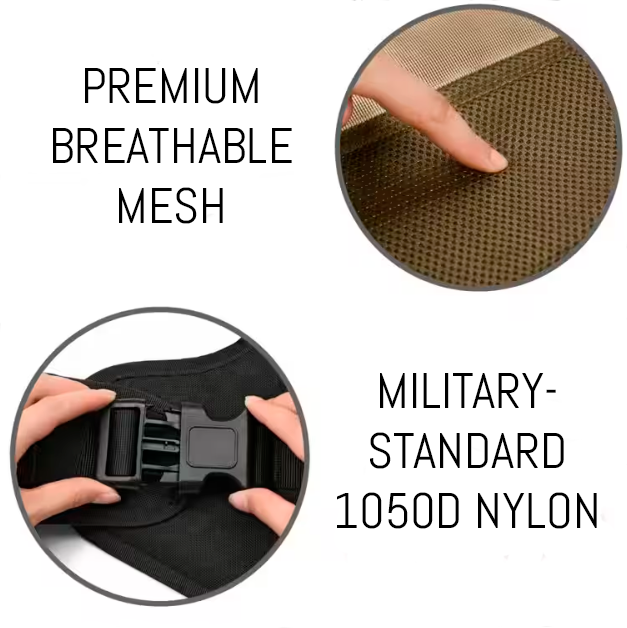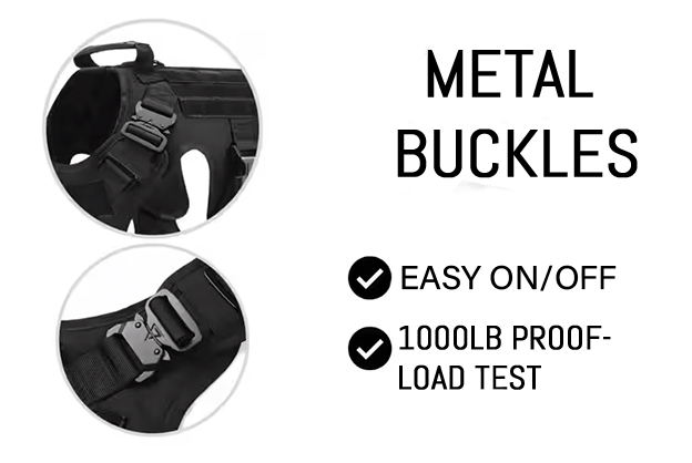 K9 tactical harness includes 2x Metal Buckles with 1000 LBS Proof-Load test on dog shoulder which is the heaviest load point when pulling.